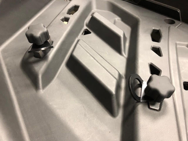Give yourself some extra tie down spots in the bed of your Can Am Maverick & X3 with our exclusive UTV INC Expandable Anchor Bed Tie Down Tab 2 Pack. Easily installs into the bed of your Maverick and X3 with the supplied knob and expandable anchor system. CNC laser cut and bent heavy duty steel tab gives you an additional tie down spot for coolers, bags, tool kits, etc. etc. etc. Fits ALL Can Am Maverick, Defender and X3 Models. Easy Installation with expandable knob anchor. CNC laser cut heavy duty steel tie down tab mount into the bed to give you a extra hold down spot. Tabs come powder coated black.